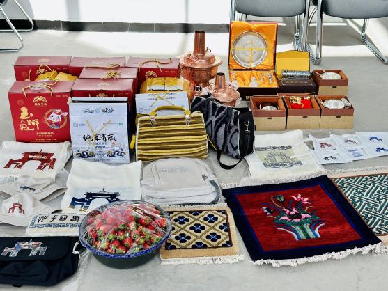 图为当地村民展示同学们所设计的文创产品杨永良展示同学们所设计的文创产品