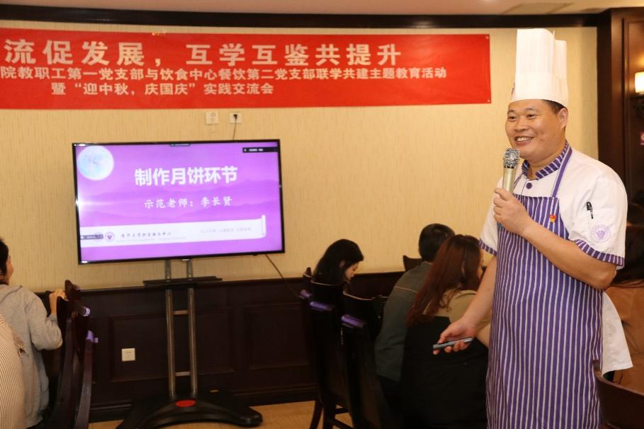 随后,饮食服务中心李长贤讲解了不同流派月饼及其制作流程,并示范和指导与会人员亲手制作手工月饼。
