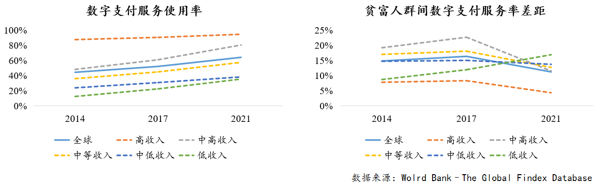 第二大趋势是数字化。全球数字支付服务发展的趋势保持增长,数字支付服务普惠化趋势显著,贫富人群服务使用差距加速减小。