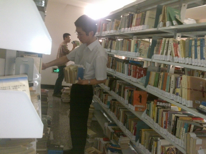 同学们分成两个小组,第一组同学主要负责整理一楼书库的一万多册合订期刊以及完成图书分类的前期工作;第二小组的同学按照索书号,将图书分门别类放在书架上。在这次活动中,党员和积极分子通力合作、不怕苦不怕累,并且不断探寻最高效的工作方式,以便较快地完成任务。