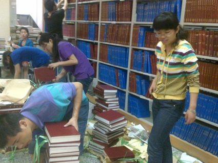 2011级党支部二十四位党员和积极分子来到金融图书馆,帮助金融馆完成图书和合订刊的整理工作。