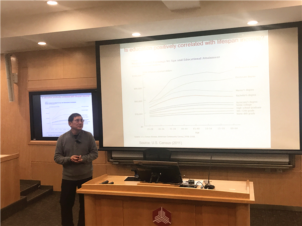 肖经建介绍说,美国人口普查局的数据表明,学历与就业、收入呈现正相关性,即学历上升,就业率和年收入也随之上升。许多美国人希望可以进入大学获得学位,从而在未来获得更好的就业机会和收入来源,尤其低收入家庭认为大学是可以提高家庭生活收入的最有效方式。然而在美国大学学费十分昂贵。据美国大学管理部估计,在2017-18年,四年制公立学校每年学费和生活费针对州内居民平均需要20770美元,外州居民需要36420美元,四年制私立学校每年的学费和生活费达到46950美元,因此,多数美国的大学生都需要申请学生贷款来支持完成学业。