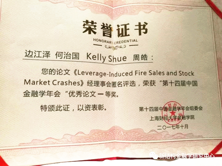 紫光金融学讲席教授周皓和对外经贸大学副教授边江泽以及芝加哥大学何治国教授、鲁大学Kelly Shue教授合著的文章《Leverage-Induced Fire Sales and Stock Market Crashes》以2015年中国股市异动为研究对象,通过大量的真实投资者账户杠杆率数据,分析了去杠杆导致的股票甩卖如何引发了大规模的股市崩盘,并从监管的角度分析了场内和场外融/配资交易对市场波动的影响。通过参会评委的匿名评审,本文获得本次年会唯一的一篇优秀论文一等奖。在会议宣讲过程中,本文也得到了大会参与者的一致好评。