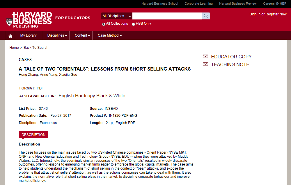 本案例关注的是两家在美国上市的中国概念股企业——东方纸业(NYSE:ONP)和新东方教育科技集团(NYSE: EDU)遭遇浑水机构做空的主要问题以及做空过程中的应对措施。它旨在帮助学生了解美国股票市场做空机制特点,引导学生分析美国上市企业容易被做空机构攻击的问题及实践中的有效应对方法,使学生认识基于信息的有效做空机制对提高股票市场效率、规范公司行为和约束经理人的作用。本案例非常适合企业管理人员培训、金融MBA 和EMBA 课堂案例教学和普通金融硕士的案例教学。