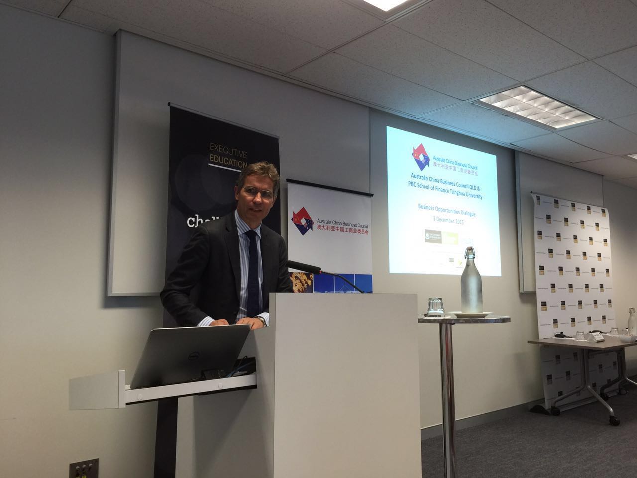 H?j教授和中国驻布里斯班总领事馆领事、经济商务室主任蒋季青以及清华五道口全球金融发展教育中心主任严骏参加了本次论坛。中国建设银行布里斯班分行行长Yoalanda Lu、中国交通银行布里斯班分行副行长Jason Dong、昆士兰州自然资源和矿产部首席地质学家Brad Jone等多家澳洲公司高管受邀出席。