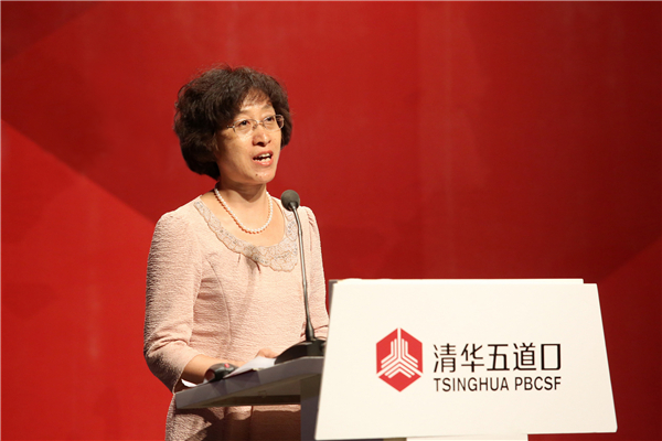 伴随着气势恢宏的国歌,开学典礼正式开始。吴晓灵院长首先代表学院向新生表示热烈欢迎。她用“学研为本”、“实践笃行”、“勇于创新”三个短语分享了她对同学们的期待。吴晓灵希望清华五道口的同学要有做出世界一流学术成果的勇气和眼界,要有做出一切可行的解决问题的方案的能力与智慧,不断推动改革创新,在学业之余通过有效的实践深刻理解国情民情,在创新道路上有魄力、有坚守,百折而不挠,衣宽而不悔,为国家和社会贡献出一股清新的力量。