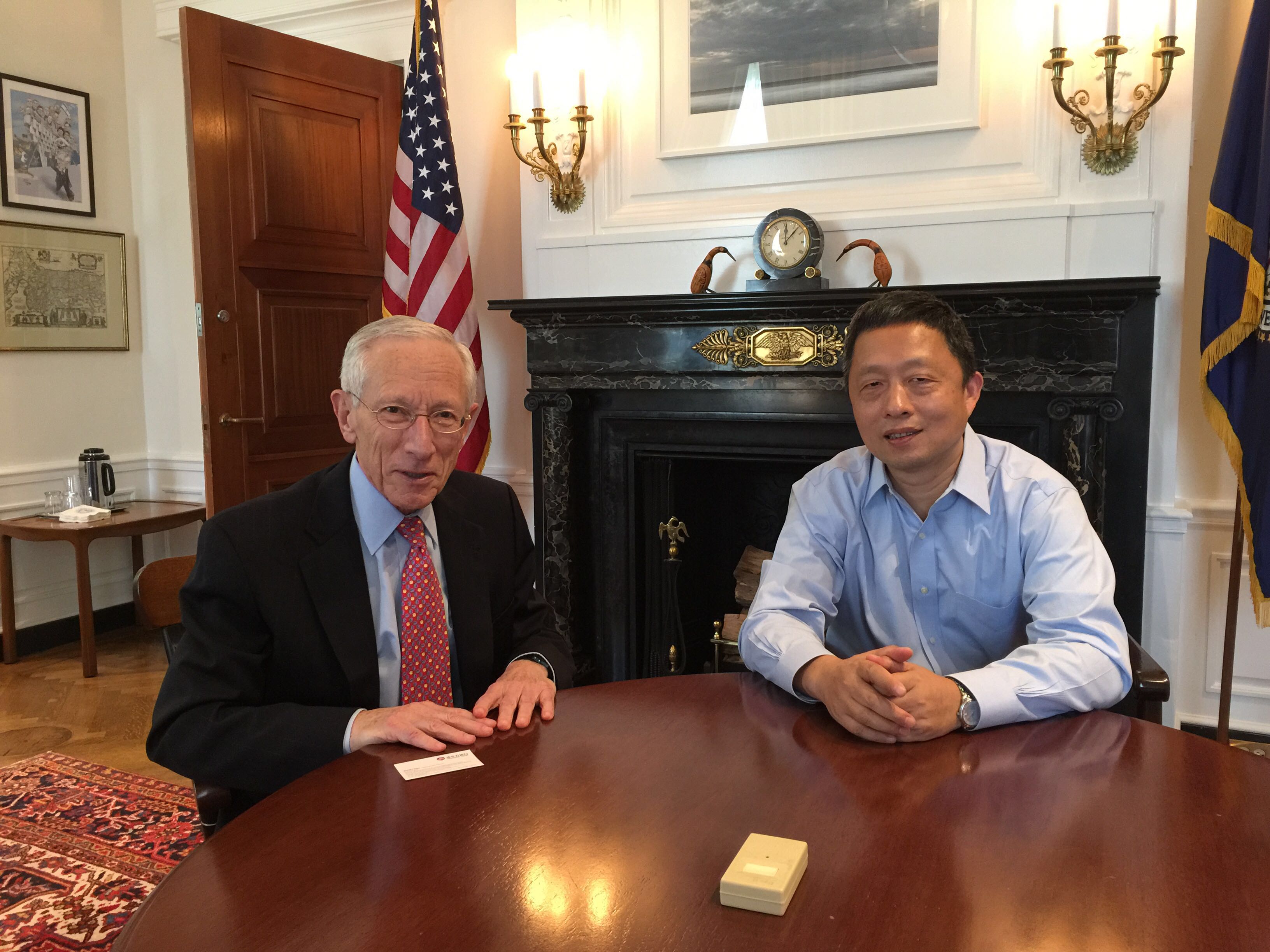 图为周皓教授(右一)与美联储副主席费希尔(左一)