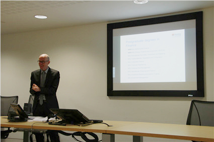 ICMA中心创始人Brian Scott-Quinn教授讲授“金融市场概览及欧洲经济前景”(Overview of the Financial Markets and the future of European Economies)。Scott-Quinn有着丰富的学术研究和金融从业经历,对全球金融行业的前沿问题有着深入的研究。在课堂上他与同学们分享了对欧债危机解决方案等问题的观点,同时对中国的商业银行发展和直接融资问题作了深入的剖析。