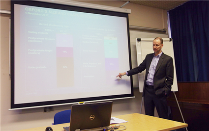 英国当地时间1月16日下午,“英国投资与交易冬令营”在英第四天,同学们访问了世界知名学府牛津大学。牛津大学办公室国际策略主任Loren Griffith 接待了冬令营一行。