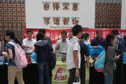 图为工商银行和北京银行工作人员向清华师生发放金融知识宣传手册