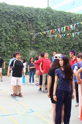 图为师生们在做气球接力前的准备