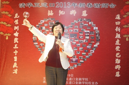 国家金融研究院的筹备情况,并向所有五道口的老师、校友以及为五道口做过贡献的人士表示诚挚地谢意。吴晓灵指出,学院正呈现蓬勃向上的新气象和新面貌,她代表学院全体员工向老师和校友承诺,一定会在尊重历史、继承传统的基础上创造出更好的成绩,希望大家共同举杯为学院的美好明天干杯。