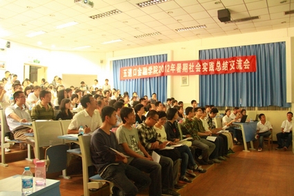 分赴祖国大江南北的八个支队的同学们首先对暑期社会实践的成果进行展示,分享各自的实践成果与感想。期间穿插趣味问答环节,现场气氛十分热烈。2011级徐琨同学还对农村金融调研的结果形成了研究报告,系统而全面地展示了同学们在调研过程中发现的农村金融当前所存在的一些问题,并结合自身所学知识提出了政策性建议。