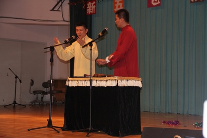 图为新闻学院李寅飞、吴天蛟表演相声《传统与现代》