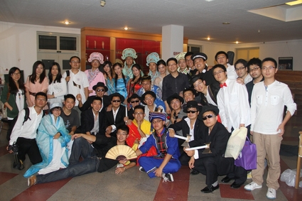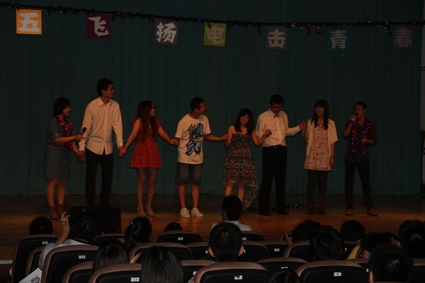 图为三个学院同学共同表演歌曲串烧《将爱情进行到底》