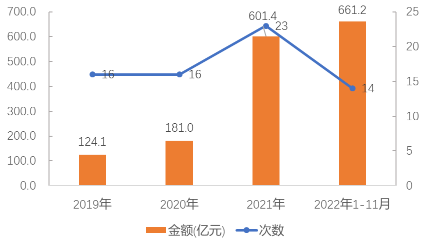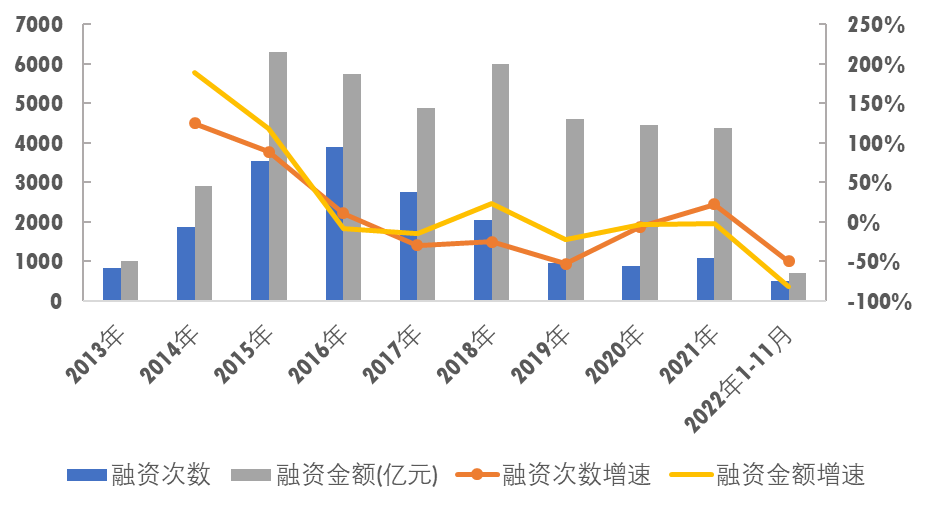 图表1:2013-2022年1-11月文化产业投融资市场融资次数与融资金额