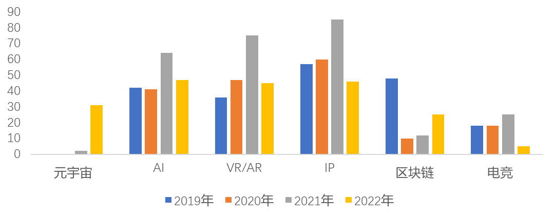 从2022年文化产业投融资热词统计情况看,元宇宙、区块链等赛道的投融资活动呈现逆市上升态势。其中元宇宙赛道上,投融资项目主要集中在元宇宙娱乐平台、虚拟人与社交社区三个领域。在VR/AR投融资赛道上,项目在消费终端和内容生产两个领域均出现明显增长。在AI投融资赛道上,利用AI技术在音视频领域提供分发服务项目、虚拟人项目增速明显,而利用AI技术进行设计、内容制作的项目逐渐得到资本关注。