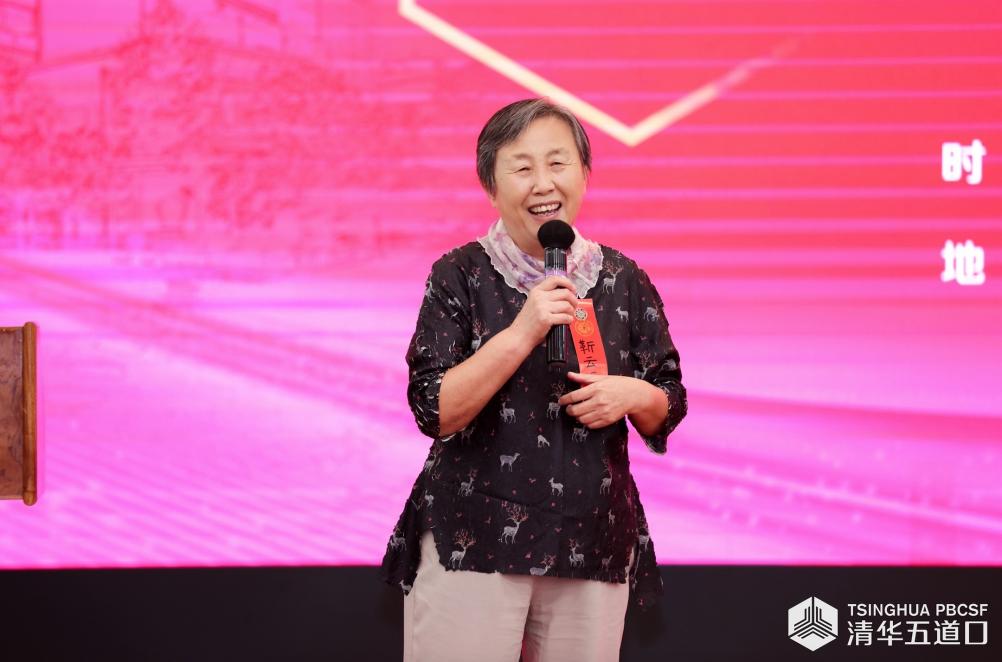 在活动的最后,靳云汇作为教师代表作总结讲话。她首先表达了再次见到大家的喜悦之情。她表示,自己和秦宛顺老师在五道口教学的30余年间,和同学们教学相长、共同进步,是一段非常美好的回忆,如今看到五道口正在蓬勃发展,心里感到由衷地高兴和欣慰。随后,她对同学们都已成为家庭的中坚力量、成为社会的栋梁之才表示祝贺;也感谢五道口的领导、老师及同学们在他们退休后,仍然时常联系,让他们从心底感到充实和温暖。最后,靳云汇老师分享了自己的人生感悟:一个人要想走得远,人品是最重要的,她用“真诚、厚道、谦卑、感恩”八个字勉励大家为国家发展、中华崛起做出更大的贡献。