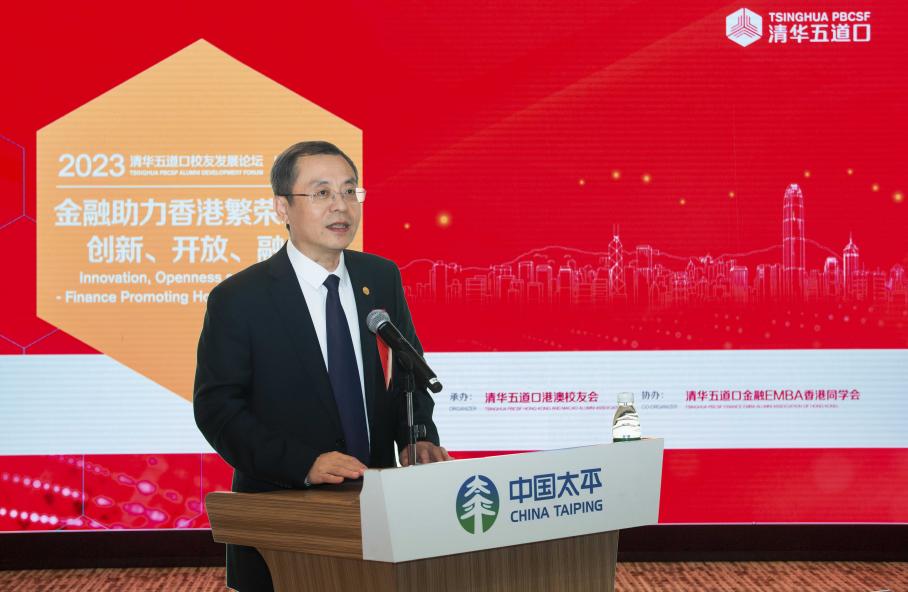 顾良飞首先代表学院和清华五道口校友会对参加本次论坛的校友们表示最热烈的欢迎与最衷心的感谢。他表示,五道口因中国金融改革而生,随中国金融发展而发展,五道口人才培养始终服务于国家经济社会发展的需要。40余年来,一批批五道口人成长为金融界的杰出领袖,成为推动中国金融体制改革和经济社会发展的中坚力量。他指出,校友既是学院办学最坚实的支持力量,也是最核心的竞争力。校友与学院之间共享资源、信息、人才、智慧,相互支持,相互倚重,相互成就。他强调,校友发展论坛是促进校友交流、探讨金融变革的重要平台,希望广大校友师生畅所欲言,发表真知灼见,分享深刻洞察,共同为金融助力香港繁荣发展出谋划策。