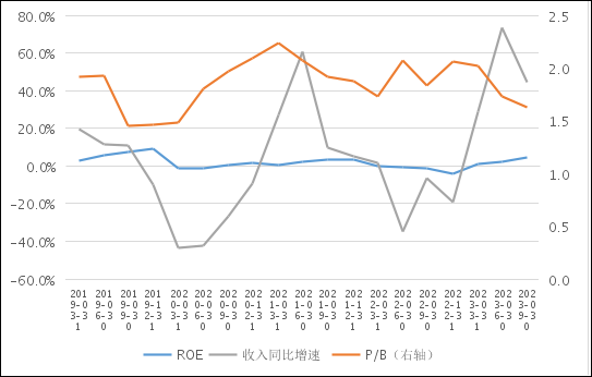图8:A股上市旅游企业ROE、收入增速及P/B情况