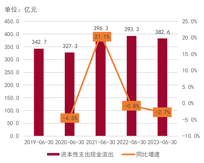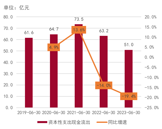 图4:2019-2023年上半年A股上市旅游企业资本性支出现金流出