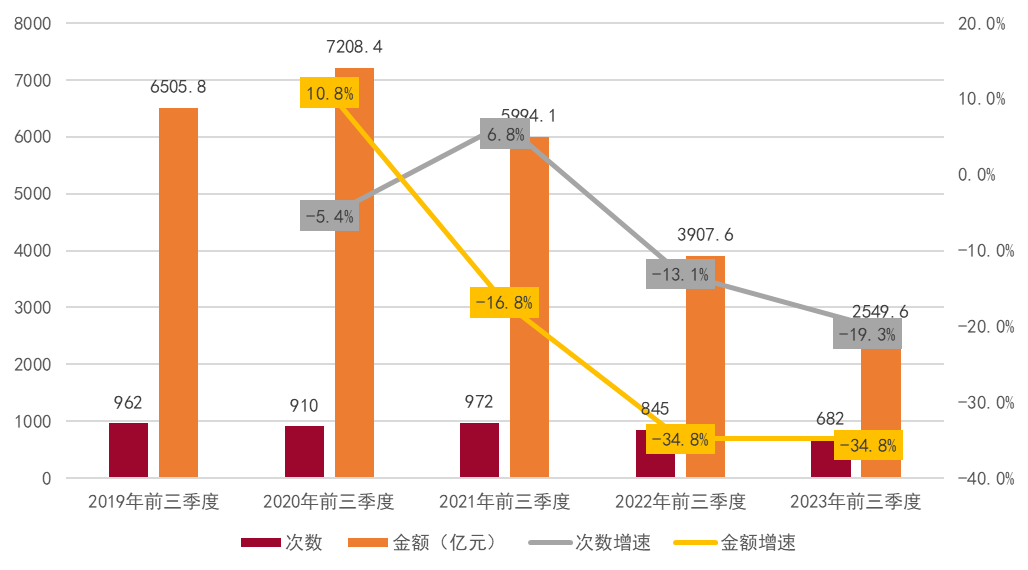 图5:2019-2023年前三季度文化和旅游产业投融资市场融资次数与金额情况