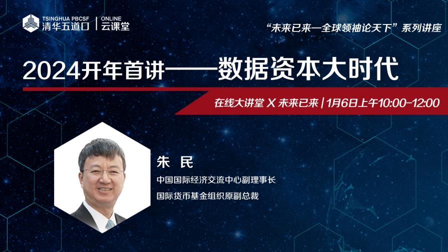 1月6日,清华五道口在线大讲堂联合“未来已来——全球领袖论天下”系列讲座,特别邀请中国国际经济交流中心副理事长、国际货币基金组织原副总裁朱民,带来“数据资本大时代”主题讲座,分享他对于如何抓住智能产业崛起带来的重大历史机遇,在全球竞争中率先建立数据资本化机制和建设相关产业链,提高数据资源的配置和使用效率,推动中国经济高质量发展的深入思考和判断。这也是朱民连续第五年莅临清华五道口在线大讲堂带来开年讲座。