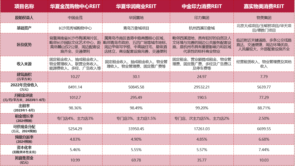 目前已获批的四单项目底层资产运营时间均在5年以上,项目成熟、现金流稳定。根据REITs招募说明书,截止2023年6月,华夏金茂购物中心REIT、华润商业REIT、中金印力消费REIT及嘉实物美消费REIT的出租率分别为98.36%、98.49%、99.2%、88.71%。值得注意的是,嘉实物美消费REIT在风险缓释措施中增加了原始权益人针对首次发售的底层项目未来5年内的可供分配金额做出补偿性承诺的条款。这是我国REITs市场首次引入“保底”协议条款,一定程度体现了原始权益人的信心和决心,也为后续项目发行提供参考。