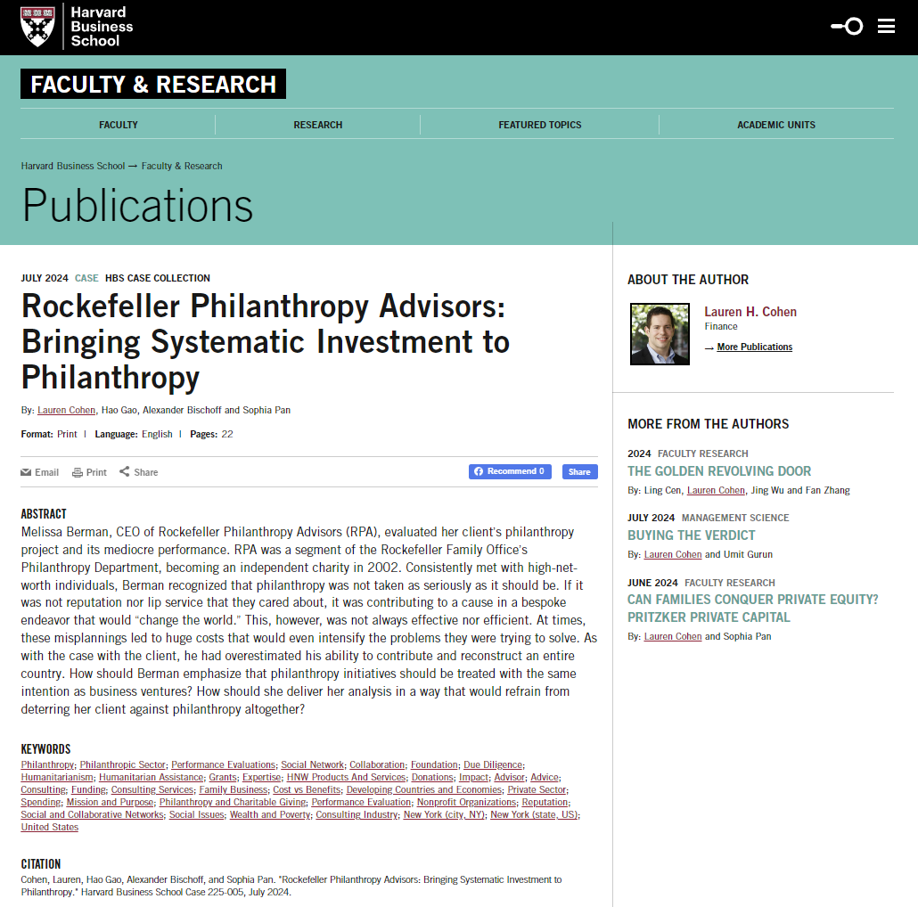 全球家族企业研究中心主任、绿色金融研究中心副主任高皓与哈佛商学院金融学讲席教授Lauren Cohen、清华五道口EMBA学生Alexander Bischoff、哈佛商学院案例研究员Sophia Pan合著的案例《洛克菲勒慈善咨询:将系统性投资导入公益慈善》(Rockefeller Philanthropy Advisors: Bringing Systematic Investment to Philanthropy)被哈佛商学院案例库收录(收录号:HBS Case 225-005)。