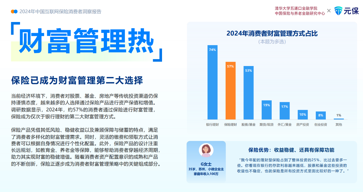 关注保险消费数据可发现,对于消费者来说,保险已从单一的风险管理工具,逐步向“保障+财富管理”复合功能演进,成为消费者资产配置的重要组成部分。《报告》数据显示,2024年消费者对保险产品的调整以在原产品的基础上升级保障为主,60%的消费者选择在原产品基础上升级保障。此外,在持续升级保障类保险产品的同时,2024年,约57%的消费者通过保险进行财富管理,保险已成为仅次于银行理财的第二大财富管理方式。