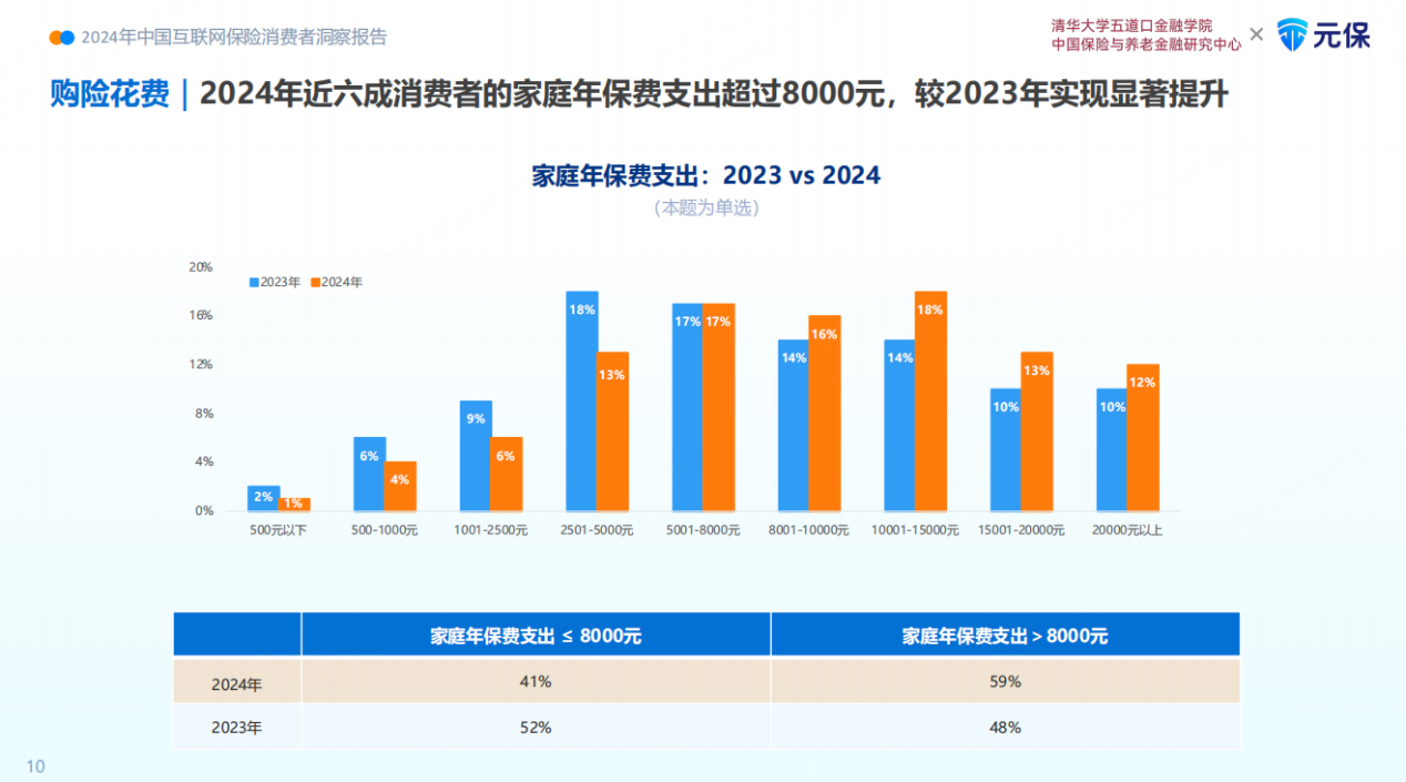 消费者在保险方面的保费支出增幅明显,未来保费预算有望再追加。《报告》显示,2024年近六成消费者的家庭年保费支出超过8000元,较2023年相比增幅明显。超六成的消费者明确表示2024年增加了家庭年保费支出。许多消费者还计划进一步追加保费预算,数据显示76%的消费者在未来2年有调整保险配置的计划,且保费预算将继续增加。这表明消费者对保险重要性的认知正逐步加深,投保意愿、保费支出以及保险需求的深度和广度都在不断提升。