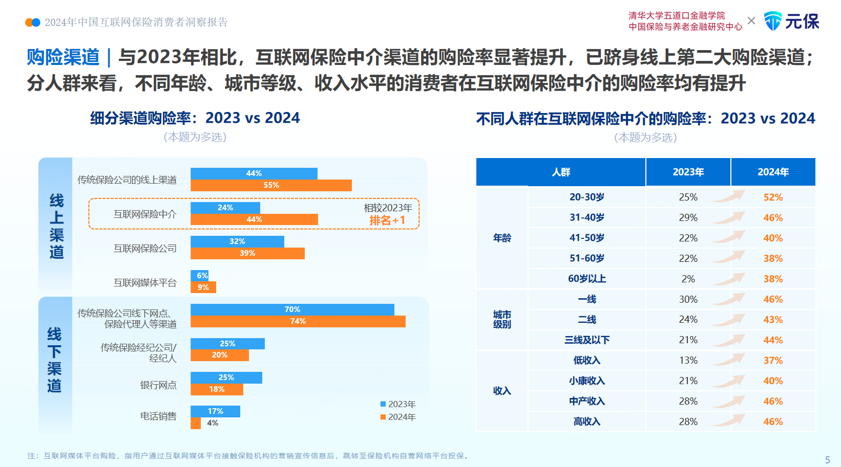 《报告》显示,2024年,消费者的线上购险率比肩线下。2024年的线上购险率已从2023年的73%升至78%,线下购险率则从2023年的85%降至79%。同时,数据显示,未来两年线上购险率有望超过线下。