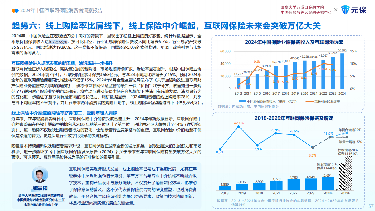 2024年8月,国家金融监管总局发布《关于加强和改进互联网财产保险业务监管有关事项的通知》,互联网财产保险业务的市场秩序进一步规范,互联网保险市场在合规框架下将实现快速且有序地发展。互联网保险正迎来全新的发展机遇,展现出巨大的发展潜力和市场机会。《报告》预测,未来5年,互联网保险年均增速将稳定保持在15%-20%,总保费有望突破万亿元大关。