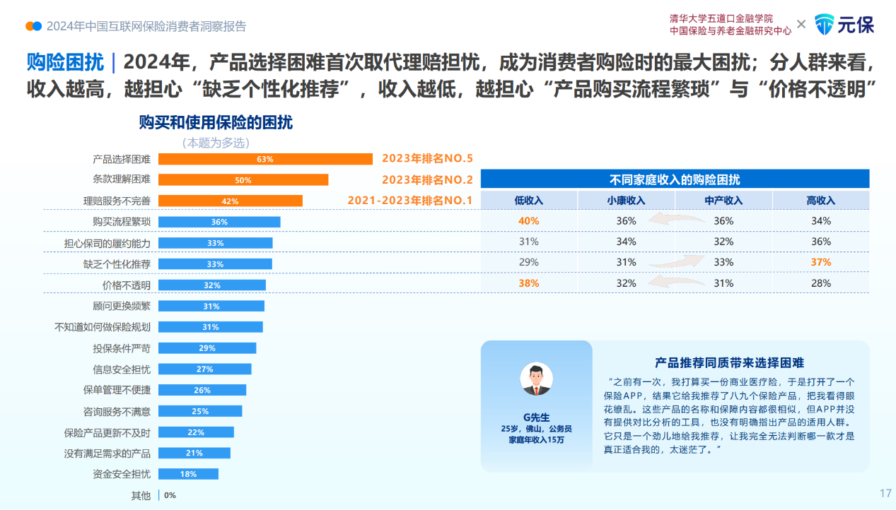 以上不难看出,伴随消费者的保险意识日趋成熟,消费者的消费理念也愈加理性。调研结果显示,与前几年相比,消费者最关切的问题已发生变化。过去消费者最大的担忧是“理赔困难或遭遇拒赔”,但2024年,“产品选择困难”跃升为第一大困扰,有高达63%的消费者表示,面对众多保险产品,他们难以做出适合自己的选择。与此同时,消费者的购买决策也愈加理性,对大品牌的盲目追求已成为过去,甚至愿意为专业咨询服务付费,约七成消费者已经或正在考虑为专业保险咨询服务付费,其中1/3的消费者付过费,超1/3的消费者愿意考虑付费。这表明,消费者在面对日益复杂的保险市场时,更加愿意为专业建议买单,以寻求个性化、精准的保障方案。