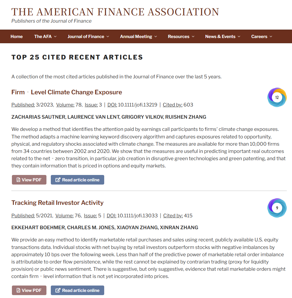 副院长、金融学讲席教授张晓燕与合作者新加坡管理大学Ekkehart Boehmer、哥伦比亚大学Charles M. Jones和中央财经大学张欣然2021年发表在金融学国际顶级期刊《金融杂志》(Journal of Finance)的论文《追踪散户投资者》(Tracking Retail Investor Activity),入选《金融杂志》近五年发表论文引用量排名榜单。此论文被引用量达到415次,在2020-2024年发表的350余篇论文中,引用量排名第二。这是继去年此论文入选《金融杂志》近五年发表论文引用量排名榜单引用量排名第三后,蝉联该榜单。