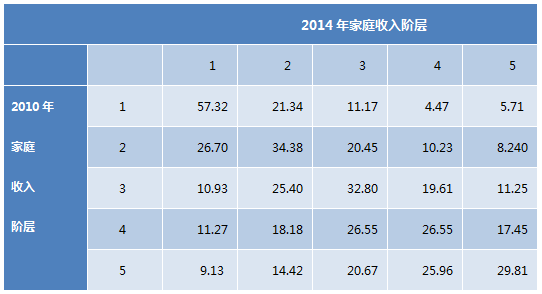 在展开讨论之前,我们首先需要弄清楚一个问题——收入阶层固化的现象在我国是否确实存在?它到底有多严重?这里我们可以借助中国家庭追踪调查在2010、2014年的两次调查数据来对这个问题做一个简单的定量分析。这个调查从2010年开始,在全国25个省/市/自治区抽取样本进行追踪调查,调查问题包含家庭的具体收入等信息,这些信息一定程度上可以帮我们刻画家庭收入的阶层变化。根据这个数据,我们可以画出样本中城市家庭在2010-2014年间的一个收入变化情况(见表1)。