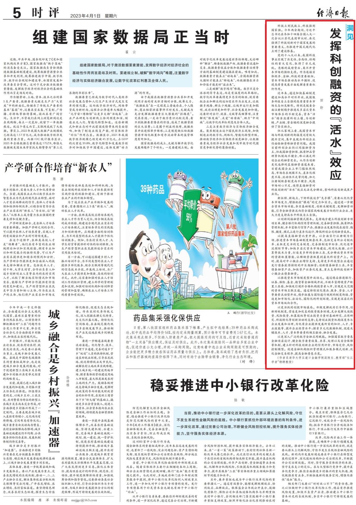 副院长、金融学讲席教授田轩撰写了题为《发挥科创融资的“活水”效应》的署名文章,对我国科创金融体系走向完善的路径进行了分析和建议。该文章已于近日刊发在《经济日报》时评版。