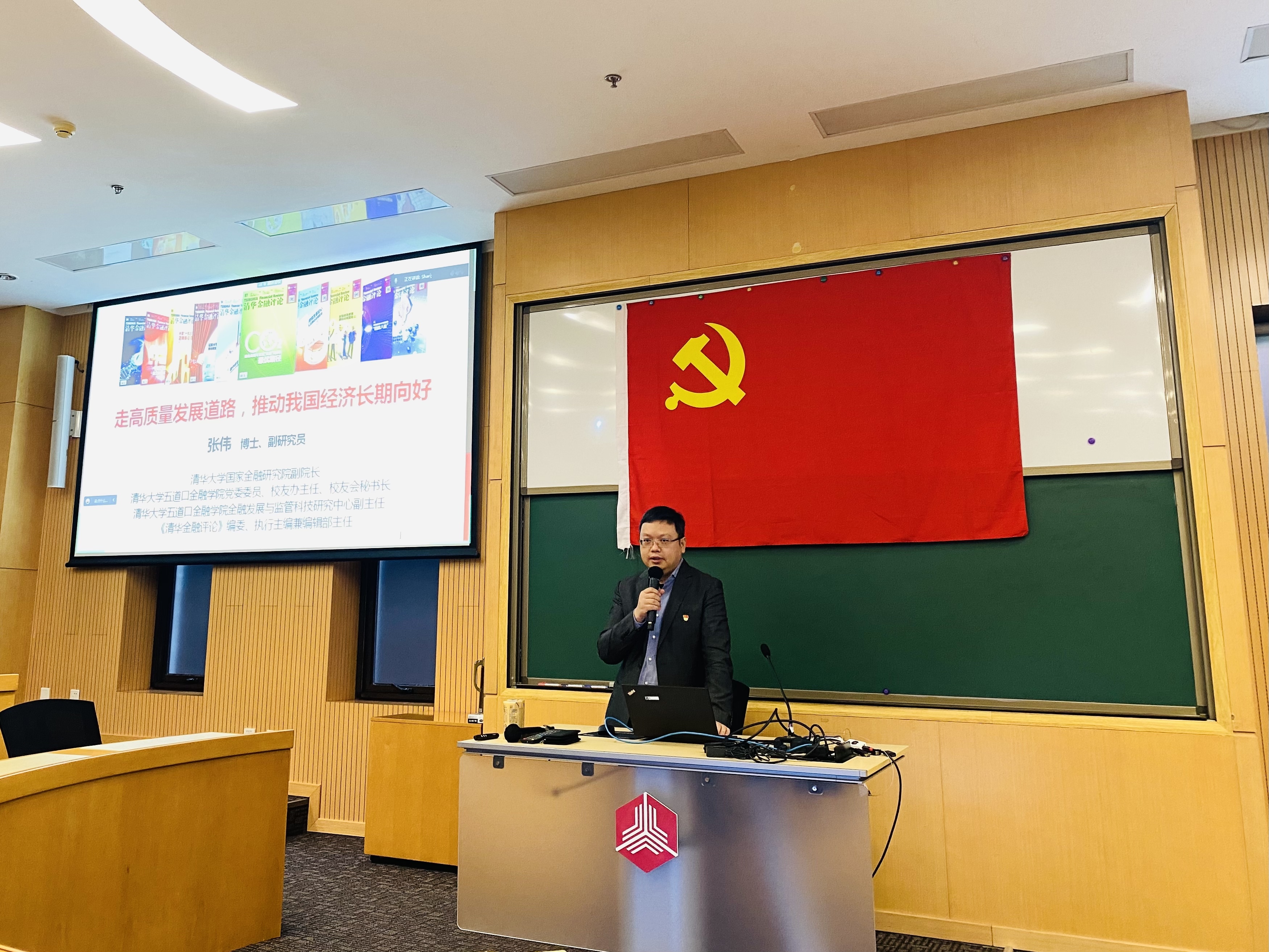 国家金融研究院副院长,教职工第一党支部书记张伟作了关于“走高质量发展道路、推动我国经济长期向好”的主题分享。在介绍了我国经济向“高质量发展阶段”的历史演进过程后,张伟根据党的二十大报告内容着重介绍了“高质量发展”的重要意义、基本内涵,以及和金融领域相关的“深化金融体制改革”重要论述的具体内容,分析了目前国内和国际经济形势面临的极端不确定性,指明了全球经济的主要特征和演化趋势,指出中国经济韧性强、潜力足、回旋余地广、长期向好的基本面不会改变。最后,张伟强调了“乡村振兴”、“促进区域协调发展”、“推进高水平的对外开放”等议题和金融学子的紧密联系,鼓励同学们积极投身到中国特色社会主义新时代推动经济高质量发展的研究工作中。