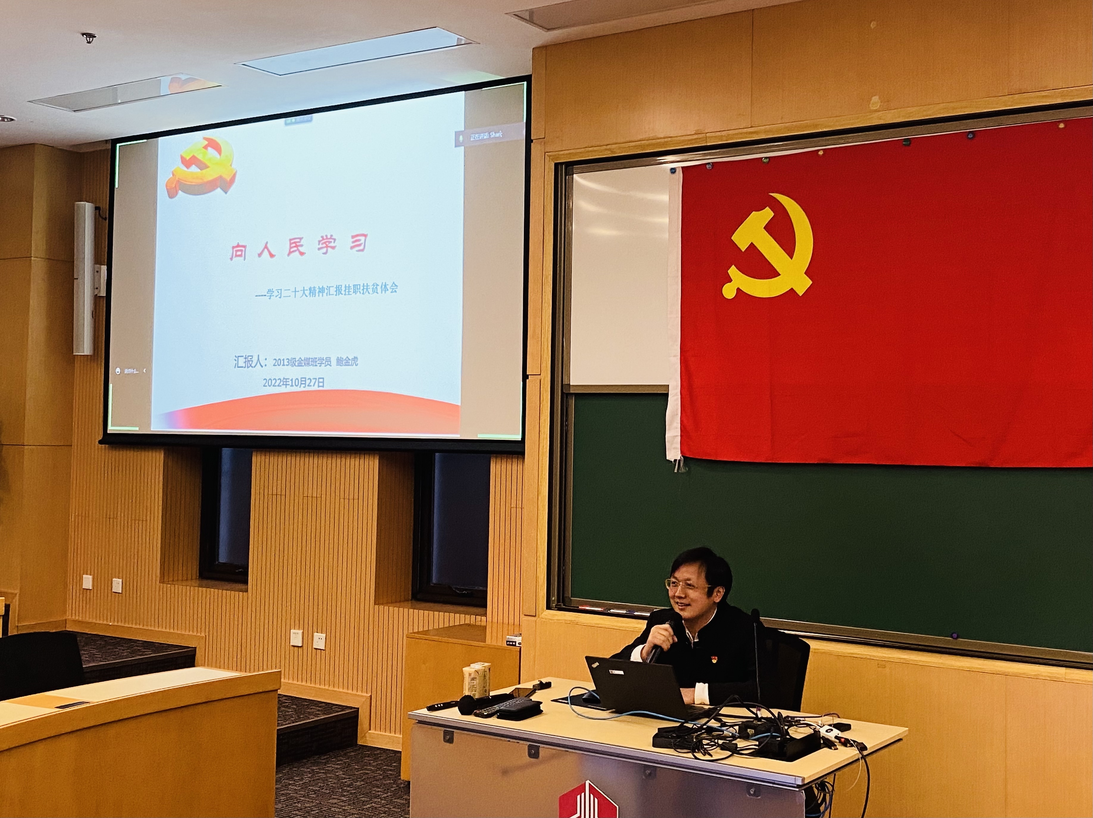党的二十大提出,必须完整、准确、全面贯彻新发展理念,坚持社会主义市场经济改革方向,坚持高水平对外开放,加快构建以国内大循环为主体、国内国际双循环相互促进的新发展格局。为深入贯彻落实党的二十大精神,金融学院师生党支部积极响应校党委组织部、党委研究生工作部号召,于10月27日下午组织开展了“喜庆二十大,力践新发展”师生联合主题党团日活动,活动围绕党的二十大报告内容和讲话精神,引导师生深刻领会习近平新时代中国特色社会主义思想的丰富内涵,喜迎二十大召开,为践行新发展理念做出贡献。此次活动由金博22党支部党支书石家豪主持。
