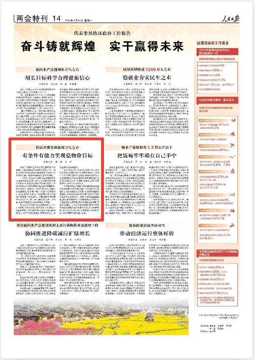 政府工作报告在今年发展主要预期目标中提出,居民消费价格涨幅3%左右。“这一预期目标设定合理,符合我国当前实际情况。”田轩对《人民日报》记者说。“十年来,我国居民消费价格涨幅稳定在2%左右的较低水平,远低于许多发达经济体的通胀水平,彰显出我国经济的强劲韧性。实现今年的CPI(居民消费价格指数)预期目标,我们有条件、有能力。”田轩分析,我国经济基础稳固,粮食稳产增产,能源市场平稳运行,商品市场供应充足,为我国物价总水平保持平稳提供了有利条件。今年强调保持政策连续性、针对性,加上保供稳价体系进一步完善,物价平稳运行态势将得到有力保障。
