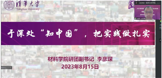 材料学院-工物系赴成都暑期社会实践支队的工作进行了总结分享,从“传承红色薪火 追寻先辈足迹”和“奋进新征程 建功新时代”等方面系统阐述了支队走进军队、深入基层、调研企业等活动,以及支队同学对传递清华声音、为实现创新驱动发展贡献清华力量的强烈渴望。