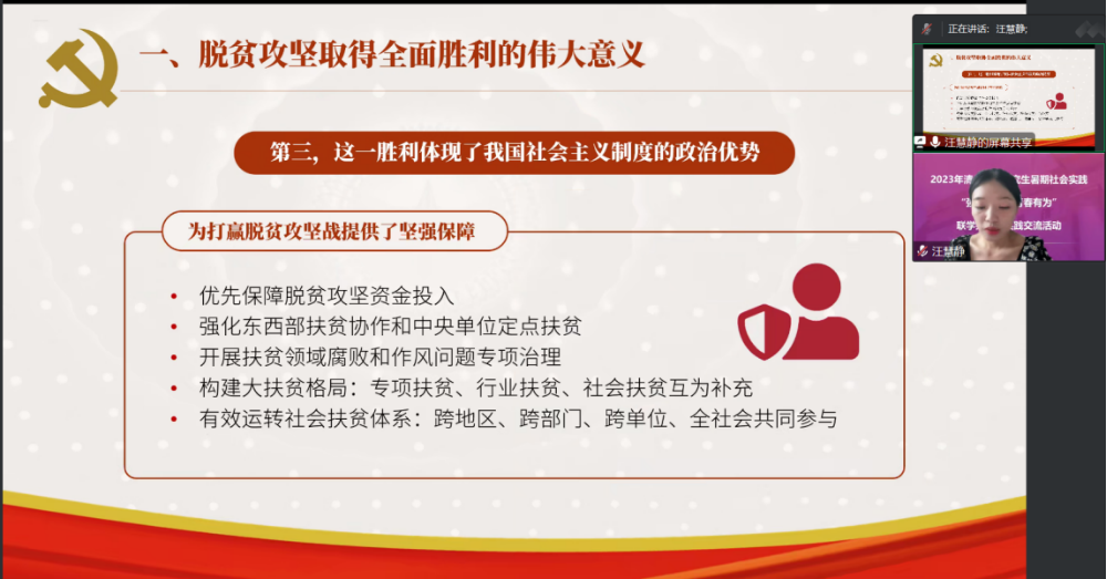 赴西藏实践支队队长汪慧静以“弘扬脱贫攻坚精神 接续奋进乡村振兴事业”为题,结合“老西藏精神”的内涵和激励作用,从乡村振兴、就业引导、专业认知三个方面出发,分享支队在西藏实践的所思、所想、所感、所为。
