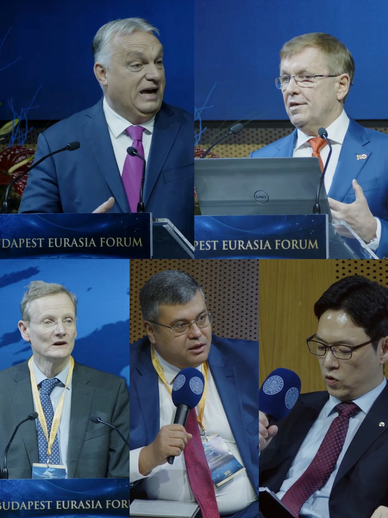 匈牙利总理欧尔班·维克托(上左)、匈牙利国家银行行长杰尔吉·马托奇(上右)、亚洲基础设施投资银行副行长兼秘书长陆书泽(下左)、哈萨克斯坦国家银行副行长阿克勒扎恩·拜马甘贝托夫(下中)、韩国银行经济研究所首席经济学家、副行长李在元(下右)出席2024布达佩斯欧亚论坛