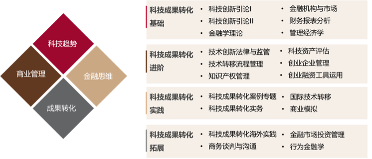 各模块内容循序渐进,形成覆盖科技创新、转移转化、管理、金融、法律、监管等多方面内容的课程体系,力图通过严谨科学的训练,使学生具备从事科技成果转化的全流程能力。