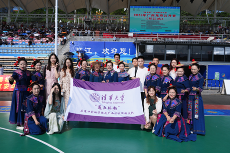 图为实践支队在龙舟赛场与民族演员们合影留念